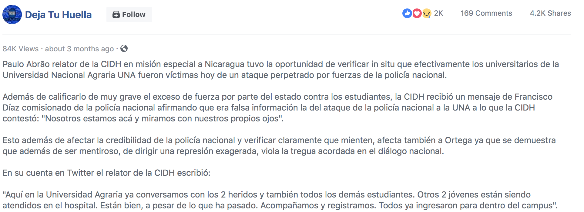 This Facebook post quotes Paulo Abrao claiming to have verified that the police attacked the opposition activists who ambushed the Sandinista supporters at the UNA. In fact, he did no such thing. What he did was take at face value the false accusations of the opposition activists without making the least effort to check them against other possible versions. He had no basis whatsoever, apart from his own flagrant bias, on which to contradict the police assertion that they had no presence at the UNA. Abrao offers zero evidence to the contrary except the false testimony of the opposition activists whose version is flatly contradicted by the injuries suffered by the Sandinista supporters ambushed by Abrao's proteges