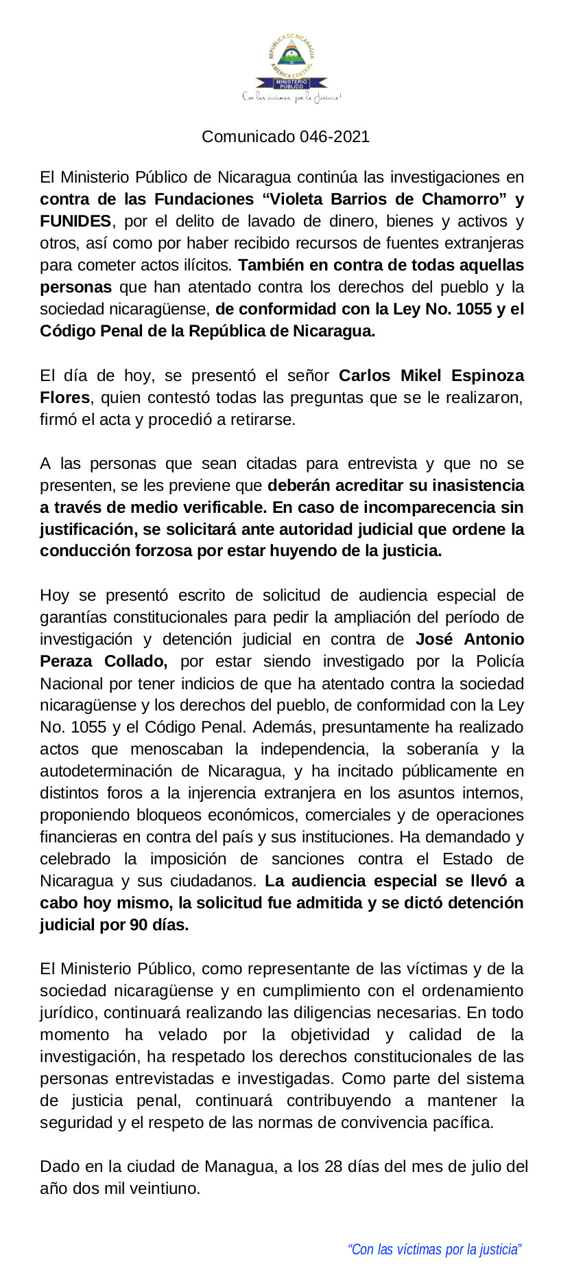 Managua, 27 de Julio de 2021