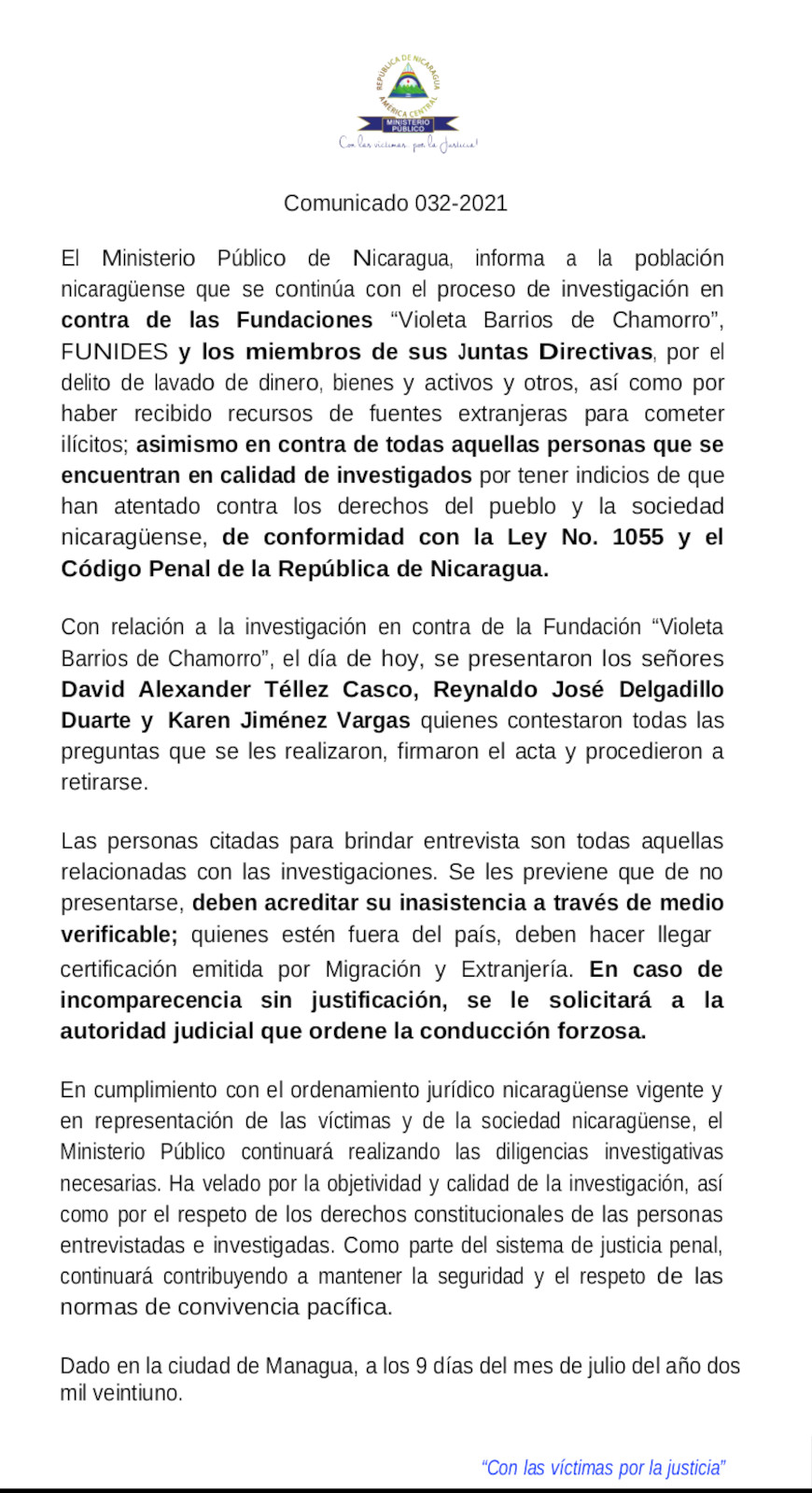 Ministerio Público informa de las investigaciones de la Fundación Chamorro y otras - 9 de julio 2021