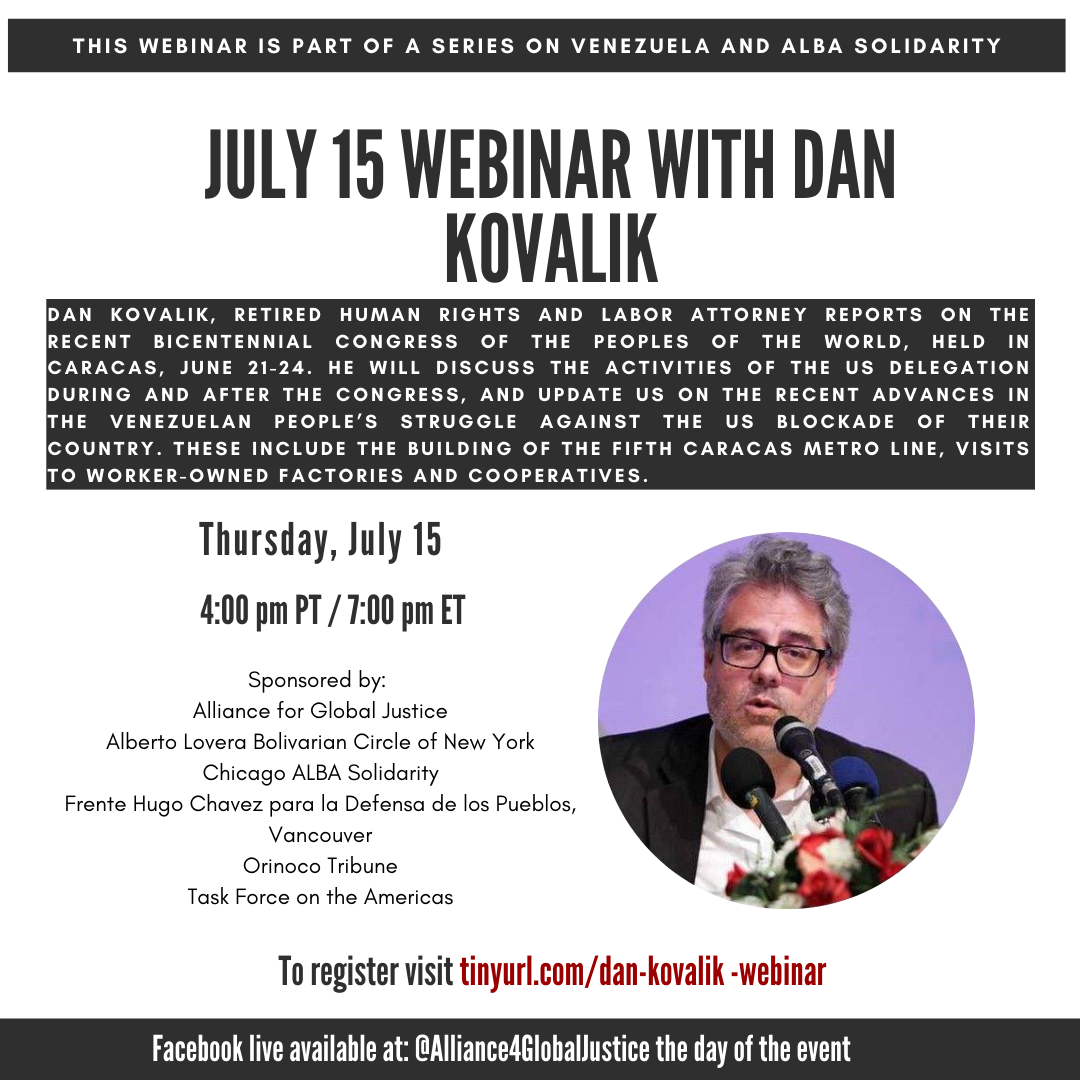 Submitted bytortilla onLun, 12/07/2021 - 07:24 Register on Zoom for July 15th Webinar Sponsored by: Alliance for Global Justice Alberto Lovera Bolivarian Circle of New York Chicago ALBA Solidarity Frente Hugo Chavez para la Defensa de los Pueblos, Vancouver Orinoco Tribune Task Force on the Americas Like what we're doing? Please consider making a donation! Contact Us Alliance for Global Justice 225 E 26th St Ste 1 Tucson, Arizona 85713-2925 202-540-8336 afgj@afgj.org