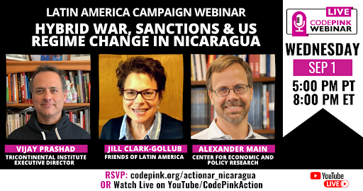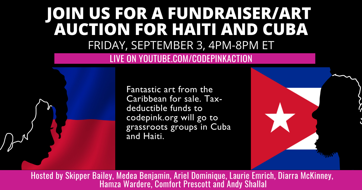 Gloria -- Please join CODEPINK tonight at 8pm ET / 5pm PT for an exciting actionar: Hybrid War, Sanctions & U.S. Regime Change in Nicaragua. Vijay Prashad of the Tricontinental Institute for Social Research, Alex Main of the Center for Economic and Policy Research and Jill Clark-Gollub of Friends of Latin America will engage in a timely discussion of the RENACER Act and U.S. attempts at regime change during this Presidential Election year in Nicaragua. After the discussion, participants will contact their Representative and urge them to vote no on the RENACER Act, which would impose brutal sanctions on the Nicaraguan people. Click here to RSVP! Then join us on Friday for a fundraiser benefiting Cuba and Haiti, where blockade-induced shortages of food and a devastating earthquake, respectively, have hit folks hard. We’re holding a solidarity fundraiser and art auction to send material aid to these Caribbean nations. The donations are tax deductible and will go to grassroots groups in Cuba and Haiti. Check out our donation page here! We’ll be livestreaming part of this event and there will be art you can bid on online. RSVP here for the livestream!