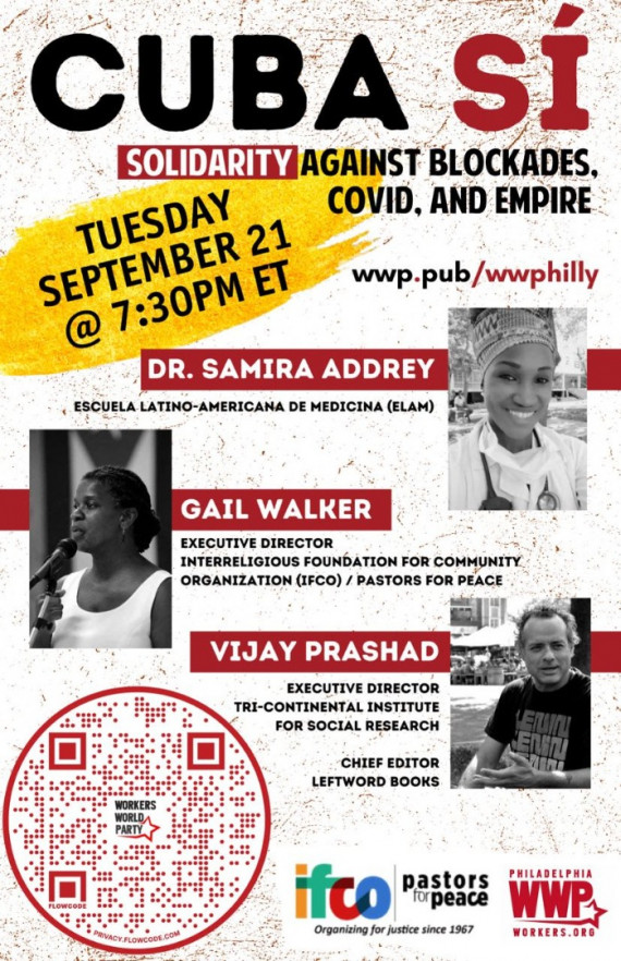 Submitted bytortilla onLun, 20/09/2021 - 15:55 Tuesday, Sept 21 7:30 pm ET/ 4:30 pm PT Register to join Tuesday's conversation Invite your friends on Facebook Hosted by Workers World Party and IFCO/Pastors For Peace FEATURING Gail Walker - Executive Director Interreligious Foundation for Community Organization – (IFCO) / Pastors for Peace Dr. Samira Addrey - Escuela Latino-Americana De Medicina (ELAM) Vijay Prashad - Executive Director of Tricontinental Institute for Social Research & Chief Editor Leftword Books DONATE to support the Pastors for Peace Caravan at ifconews.org Register now!