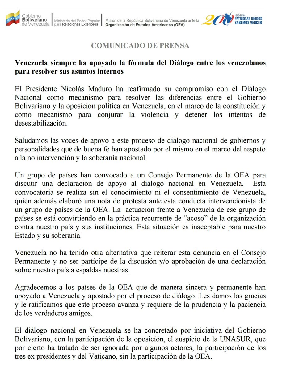 Gobierno de Venezuela reafirma su compromiso con el Diálogo Nacional