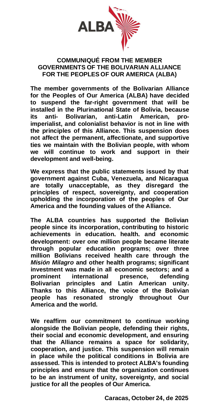 ALBA-TCP suspends Bolivia's government for behavior against the alliance