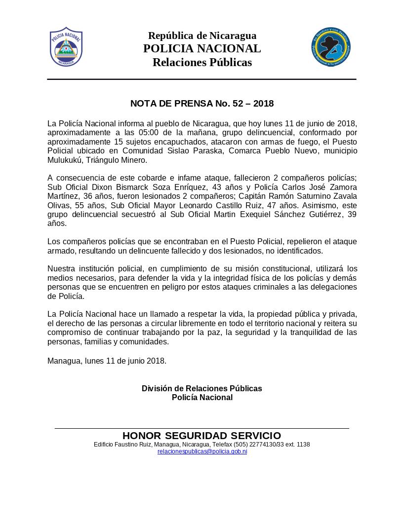 POLICIA NACIONAL : Reporte de ataque a puesto policial en municipio de Mulukukú