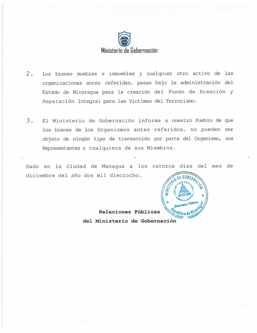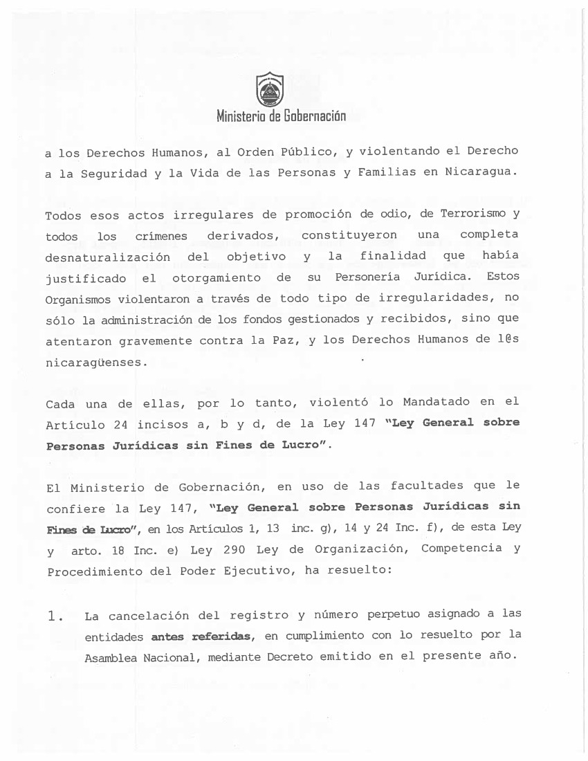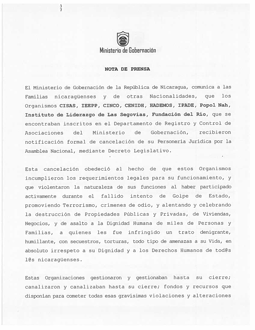 Ministerio de Gobernación aclara cancelación de personería jurídica de 9 ONGs