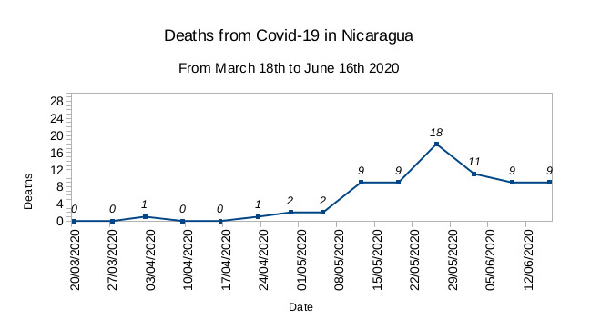 En el informe semanal del gobierno sobre los casos de Covid-19, pacientes recuperados y muertes el 2, 9 y 16 de junio, hubo constantemente menos casos nuevos cada semana, así como menos muertes. Esto significa que Nicaragua alcanzó su pico de nuevos casos en la semana que terminó el 26 de mayo y ahora está muy por debajo de la curva y el Covid-19 pronto será una enfermedad del pasado.
